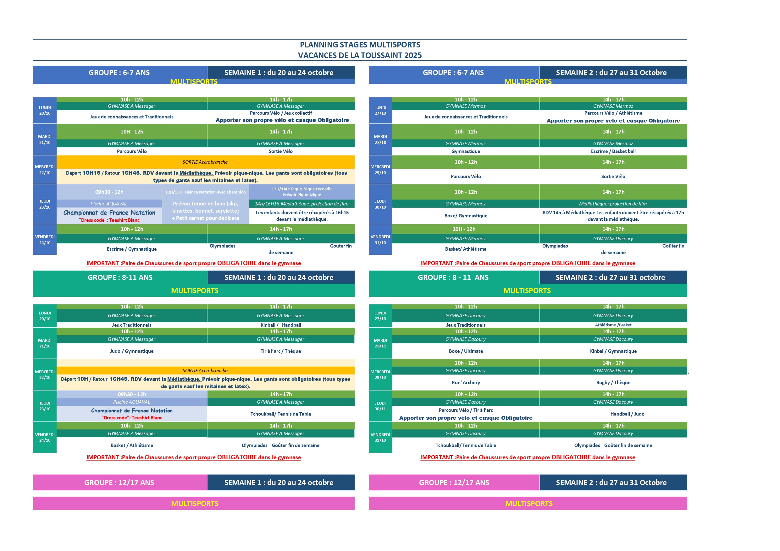 Vous trouverez ci-joint le planning modifié des activités proposées par l'EMS pendant les stages multisport de la Toussaint.